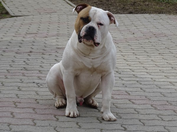 Növésben lévő buldózer kinézetű bully kan. Apacs örököse, csak egy egészen más típusú orrszerkezettel. Hosszú, „csőrös” fangja, szépen ívelt orrlyukai reményeink szerint biztosítja majd az egészséges, sportos felnőtt élet lehetőségét. Ő is egy tank, akár csak Apacs, feje jobb oldalán barna szemfolttal, és a testén, farktőben és oldalán kisebb barna jegyekkel.